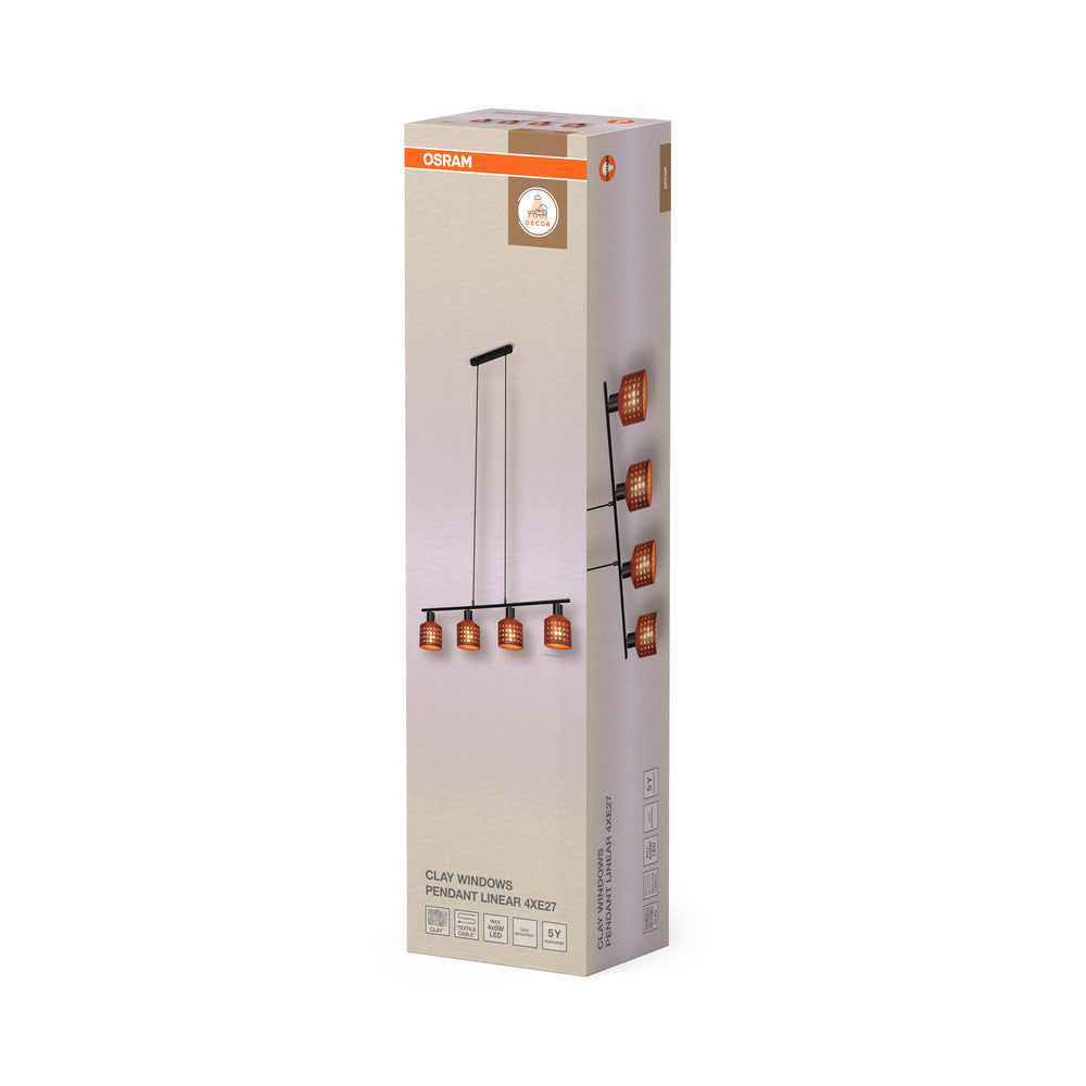 Die OSRAM DECOR Clay Windows Pendelleuchte LN 4xE27 Brown vereint dekoratives Ton-Design mit moderner Leuchttechnik – perfekt für Flure, Eingänge, Treppenhäuser und Wohnzimmer. Die braune Ton-Optik und das Metallgehäuse schaffen eine warme, einladende Atmosphäre, die zu vielen Einrichtungsstilen passt.