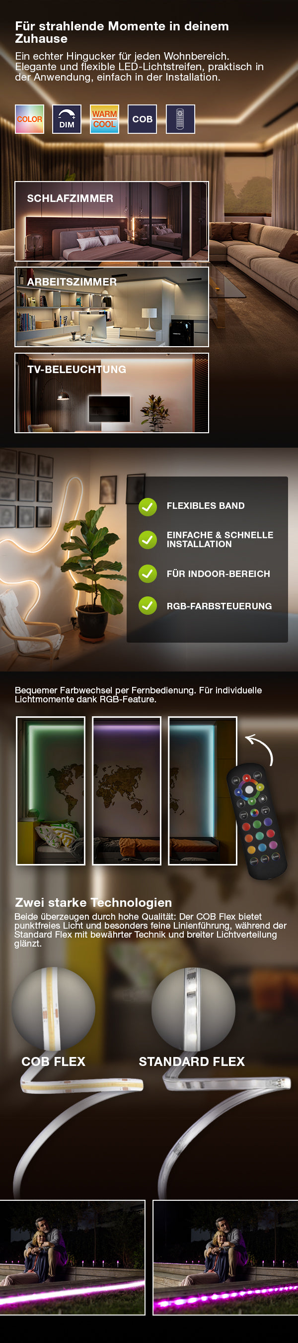Decoratieve, op batterijen werkende COB-strips met warm wit licht.