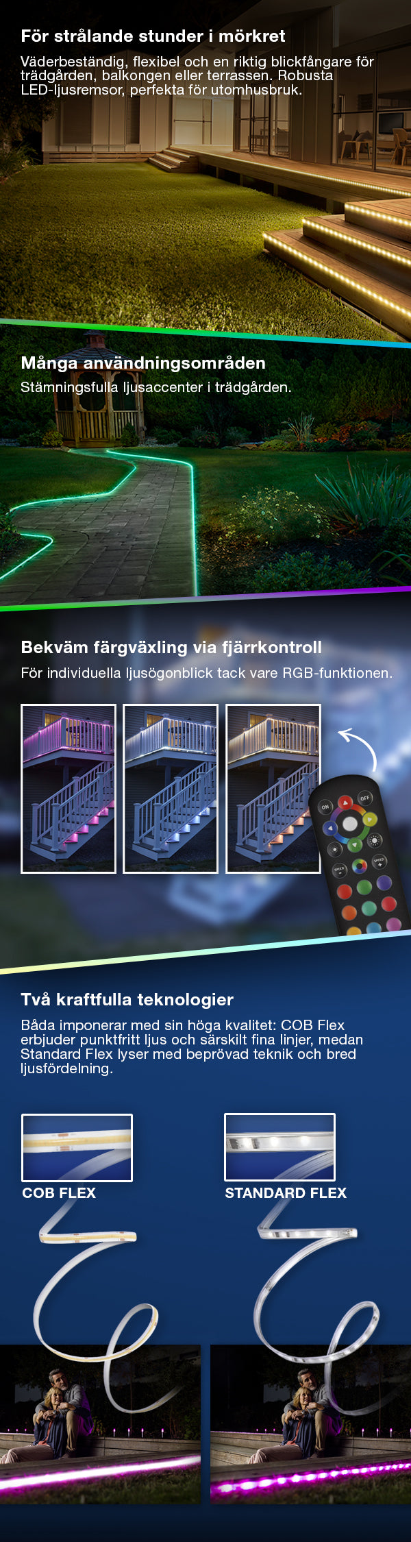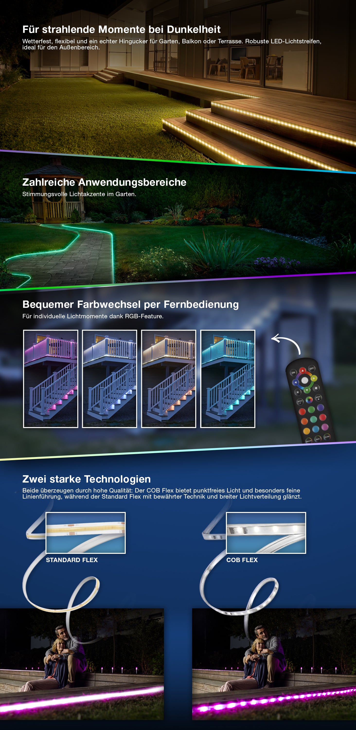 Decoratieve LED-strips voor buitengebruik met homogene lichtverdeling, IP44. Productkenmerken: COB-technologie voor homogene lichtverdeling. Lichtkleur: Warm wit. Flexibele, buigbare LED-strips. Beschermingsklasse: IP44. Productvoordelen: Snelle en eenvoudige installatie. Homogene lichtverdeling. Uniforme lichtverdeling dankzij COB-LED's. Toepassingsgebieden: Buiten. Indirecte verlichting. Technische uitrusting: Complete montage- en aansluitaccessoires meegeleverd.