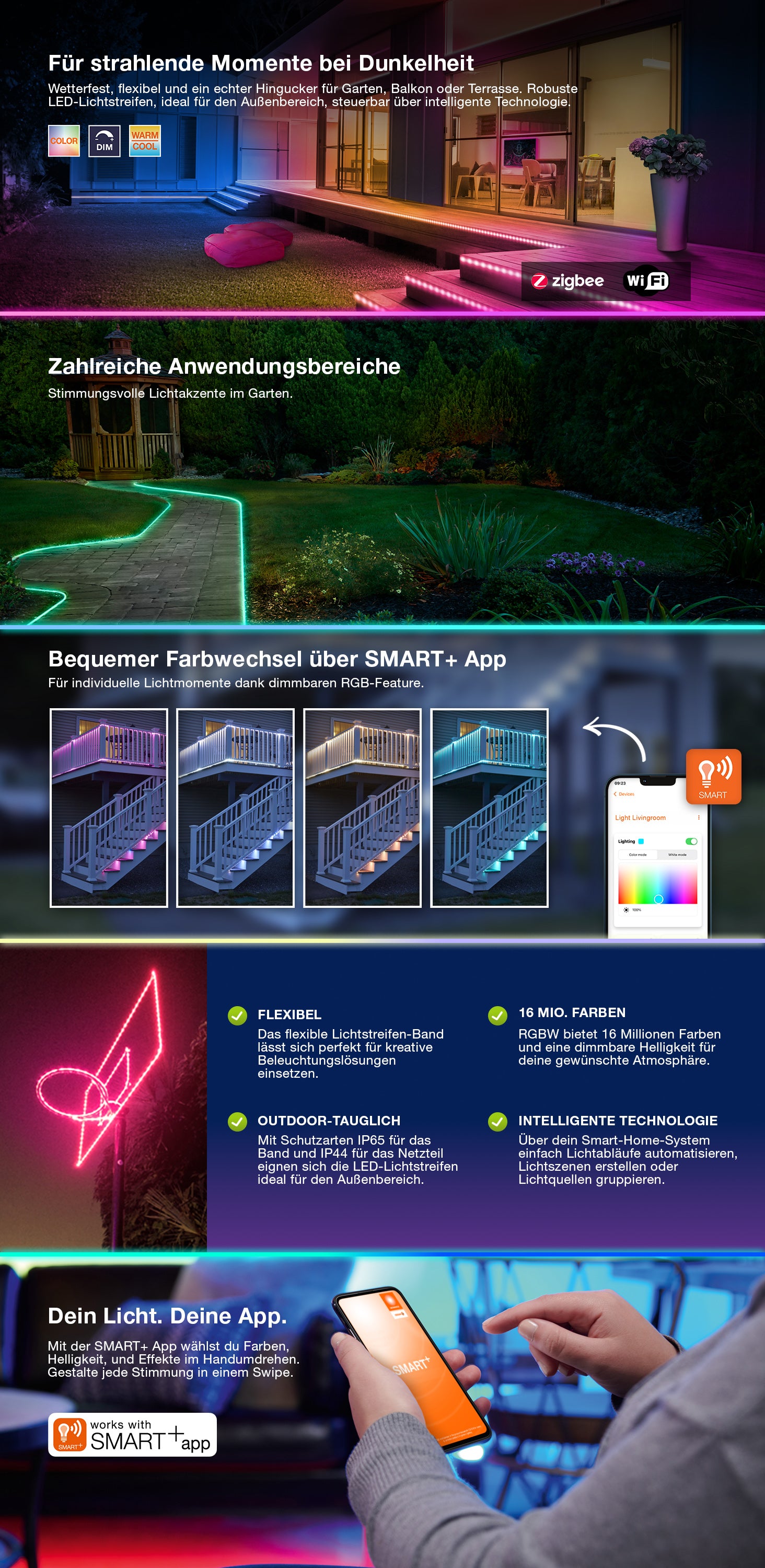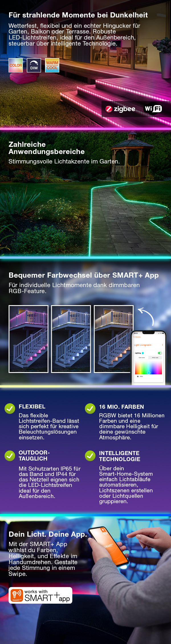 Flexibele LED-lichtstrips voor buiten met Zigbee-technologie. Productkenmerken: Flexibele RGBW-strip met intelligente draadloze bedieningstechnologie. RGB-kleurregeling, circa 16 miljoen instelbare kleuren. Kleurtemperatuur instelbaar via Tunable White: 2000–6500 K. Dimbaar. Montage met standaard cliptechnologie. Beschermingsklasse (strip): IP65. Beschermingsklasse (voeding): IP44. Netwerkprotocol: Zigbee. Levensduur: tot 20.000 uur. Bediening via een compatibel smart home-systeem (gateway en app) of SMART+ Switch. Voor volledige functionaliteit is een verbinding met een compatibel smart home-systeem (gateway en app) vereist. Productvoordelen: Eenvoudige installatie en gebruik. Toepassingsgebieden: Algemene verlichting. Tuinen. Terrassen, balkons. Technische uitrusting: Voeding meegeleverd. App-bediening vereist het LIGHTIFY-systeem (app en gateway) of een ander compatibel smart home-systeem.