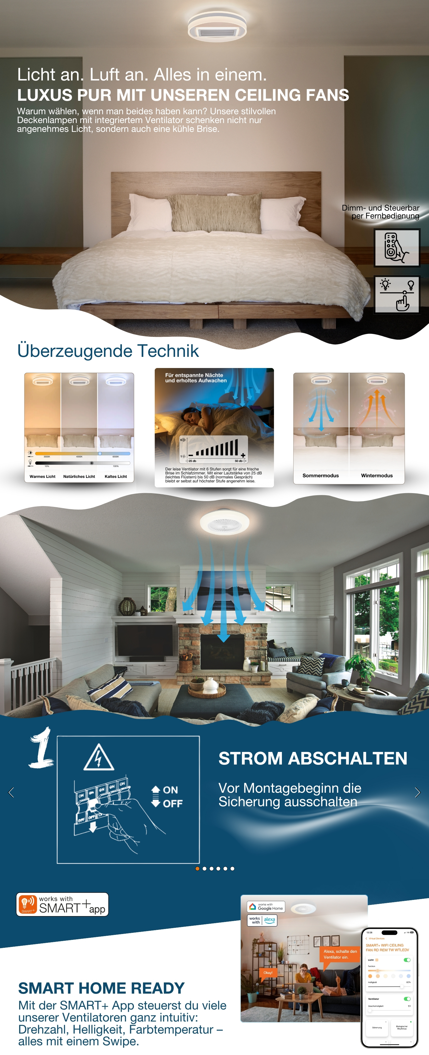 Slimme wifi-plafondventilatoren voor diverse toepassingen, die licht en ventilatie combineren. Productkenmerken: Netwerkprotocol: wifi. Armatuur met geïntegreerde ventilatiefunctie. Instelbare luchtsnelheid. Kleurtemperatuur en RGB-kleurregeling via Smart Control. Bediening via de SMART+ app. (met minimaal Android™ 4.4 of iOS 14.0). Inclusief afstandsbediening voor netwerkonafhankelijke bediening. Productvoordelen: Strak design, compatibel met diverse interieurstijlen. Eenvoudige installatie. Toepassingsgebieden: Keuken, woonkamer, kinderkamer of kantoor. Alleen voor binnenverlichting. Technische specificaties: Complete montage- en aansluitaccessoires meegeleverd. App- of spraakbediening vereist een compatibel smart home-systeem. Voor bediening via SMART+ Voor de app is een smartphone of tablet vereist. Afstandsbediening meegeleverd.