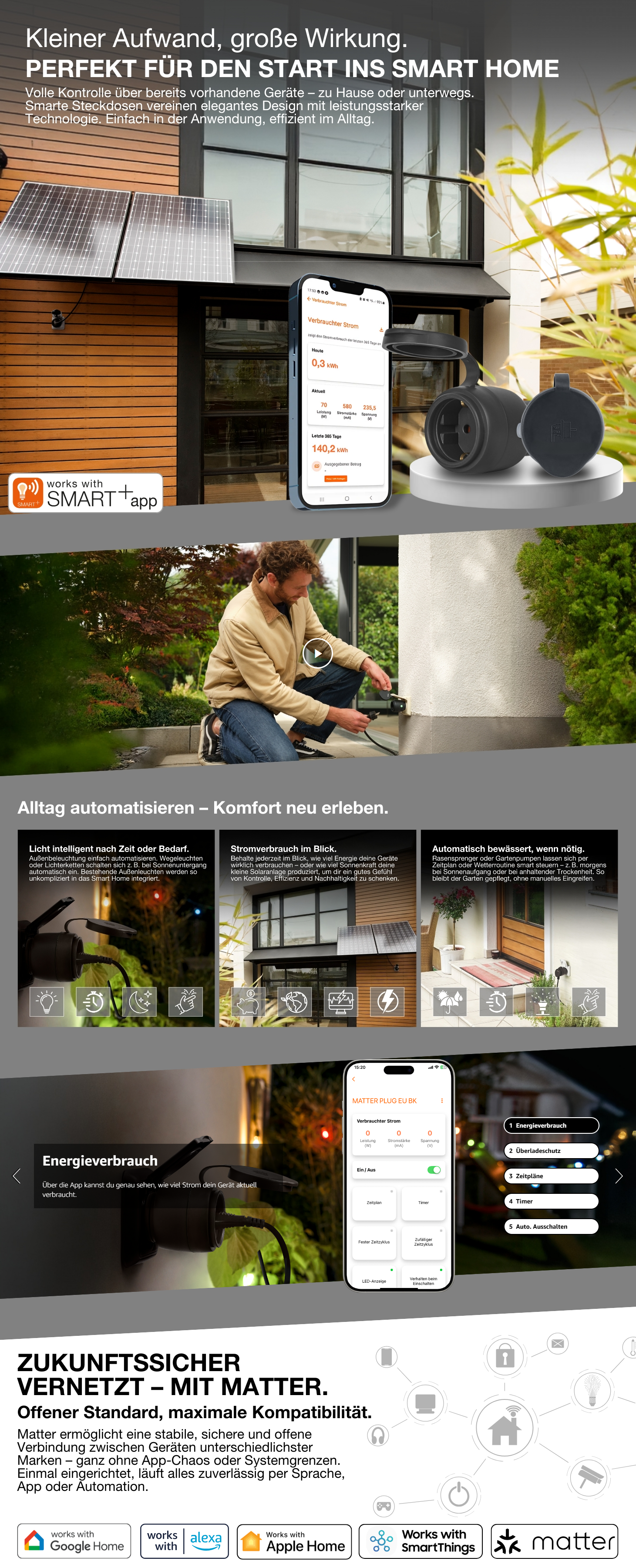 Compact slim stopcontact voor buiten met energieverbruiksregeling via Matter over WiFi-technologie.