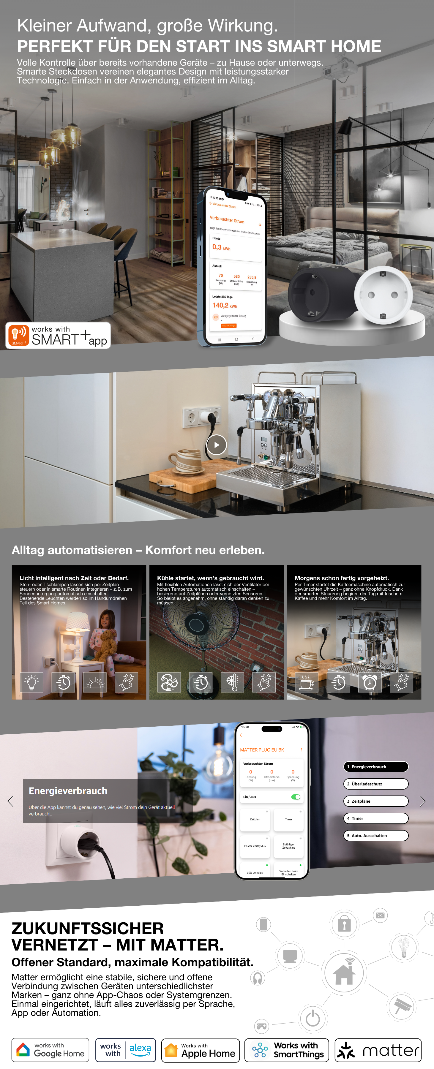 Slim stopcontact met Matter over WiFi-technologie voor het integreren van elektrische apparaten in het smart home-systeem.